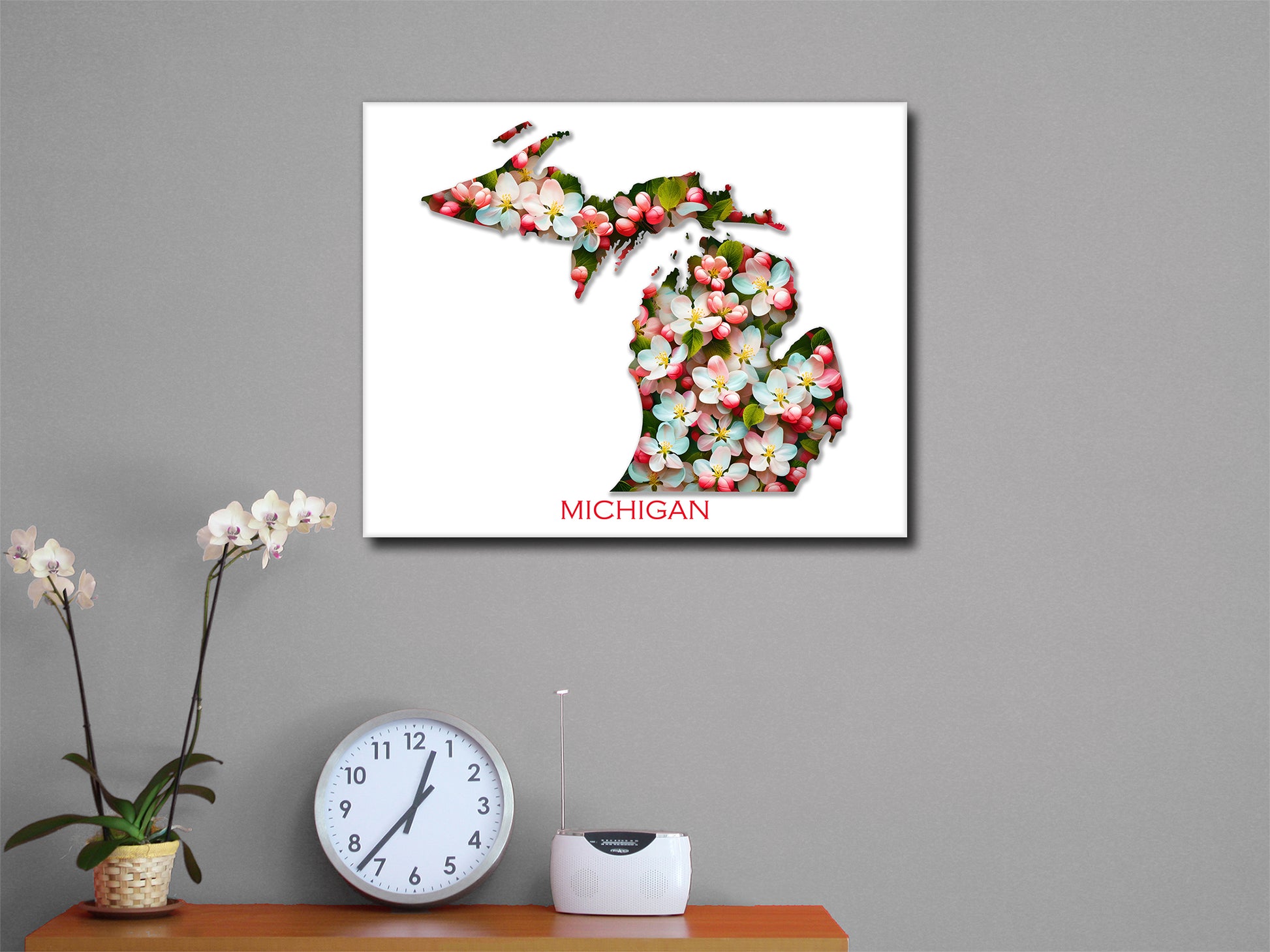 A watercolor-themed work of the beautiful state flower, the Apple Blossom, forming the Great State of Michigan.